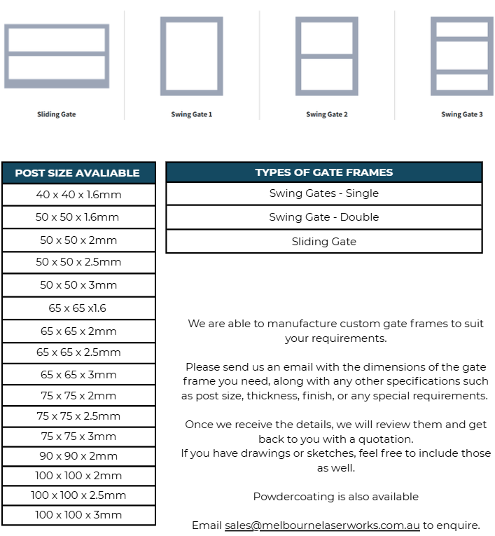 We offer custom gate frames built to suit your exact specifications. Whether you need a specific size, style, or design, we can fabricate a frame to match your project requirements.
